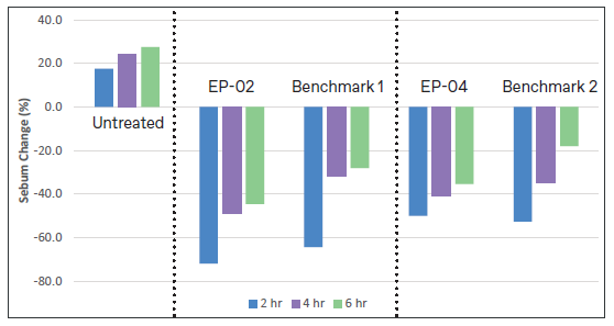 In addition to working well with a wide variety of cosmetic ingredients, PURESIL™ EP series demonstrated the ability to absorb sebum and maintain hydration with the use of humectant. Sebum absorption without drying out the skin is a sought-after benefit for skin (potentially also for scalp care). Acne is one of the most common skin conditions in young adults and some people well into their 30s. While many factors can cause acne, increased sebum production is one of them. Control excess sebum can be the first defense in preventing acne and an oily/greasy skin appearance.