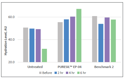 PURESIL™ elastomer powder showed significant sebum absorption. Figure 3 shows PURESIL™ EP 02 and EP 04 to be on par or better than the competitive benchmarks in sebum control over time. The hydration level was measured by a Corneometer® on the skin treated with a moisturizing cream with 2% elastomer powder. Figure 4 shows a sustained and slight increase in hydration on skin treated with moisturizing cream with PURESIL™ EP 04 compared to the one with the competitive benchmark.