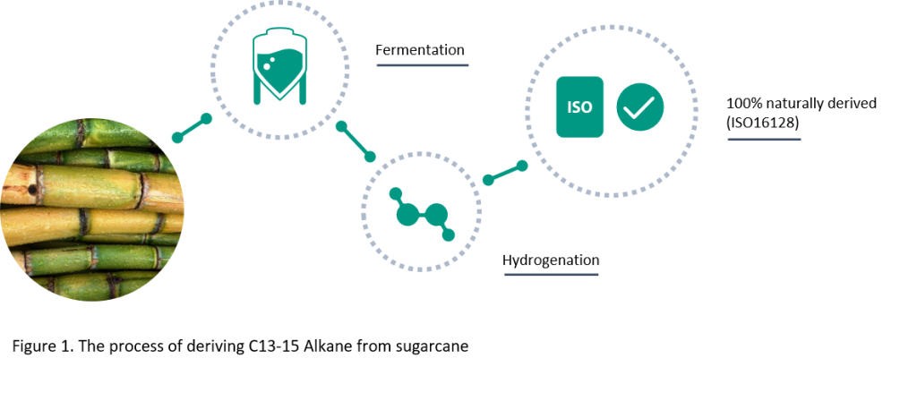 Different from other C13-15 Alkanes on the market, this alkane was chosen for its sustainable eco-design. This C13-15 Alkane is derived from renewable sugarcane. Sugarcane as a natural feedstock was chosen for its fast regeneration and minimum irrigation. The conversion was through fermentation and hydrogenation where the bagasse was used for energy cogeneration to further lower the carbon footprint[i]. A schematic depicting the process is shown in Figure 1.