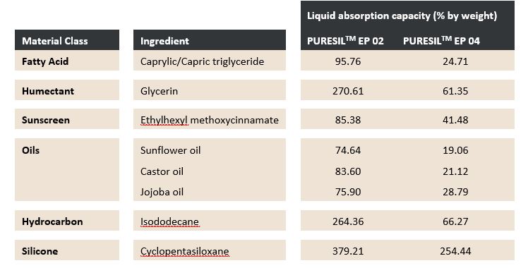 Among many challenges formulators face is the compatibility of ingredients. To achieve the desired form, function and texture, the ingredients need to stay together and work in concert in the final product. Often, it takes a significant amount of trial and error to derive a stable formula. PURESIL™ EP series, due to their flexible crosslinked network, can intake (absorb and adsorb) a wide variety of cosmetic ingredients. Table 1 shows the percent by weight intake of a wide variety of common cosmetic ingredients by PURESIL™ EP series.