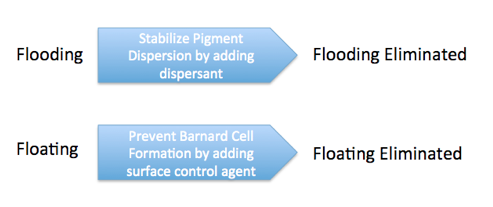 Overcoming flooding and floating in solvent-borne paints primarily involves utilizing a suitable pigment dispersant and the elimination of Benard Cell formation with the addition of a surface control agent.