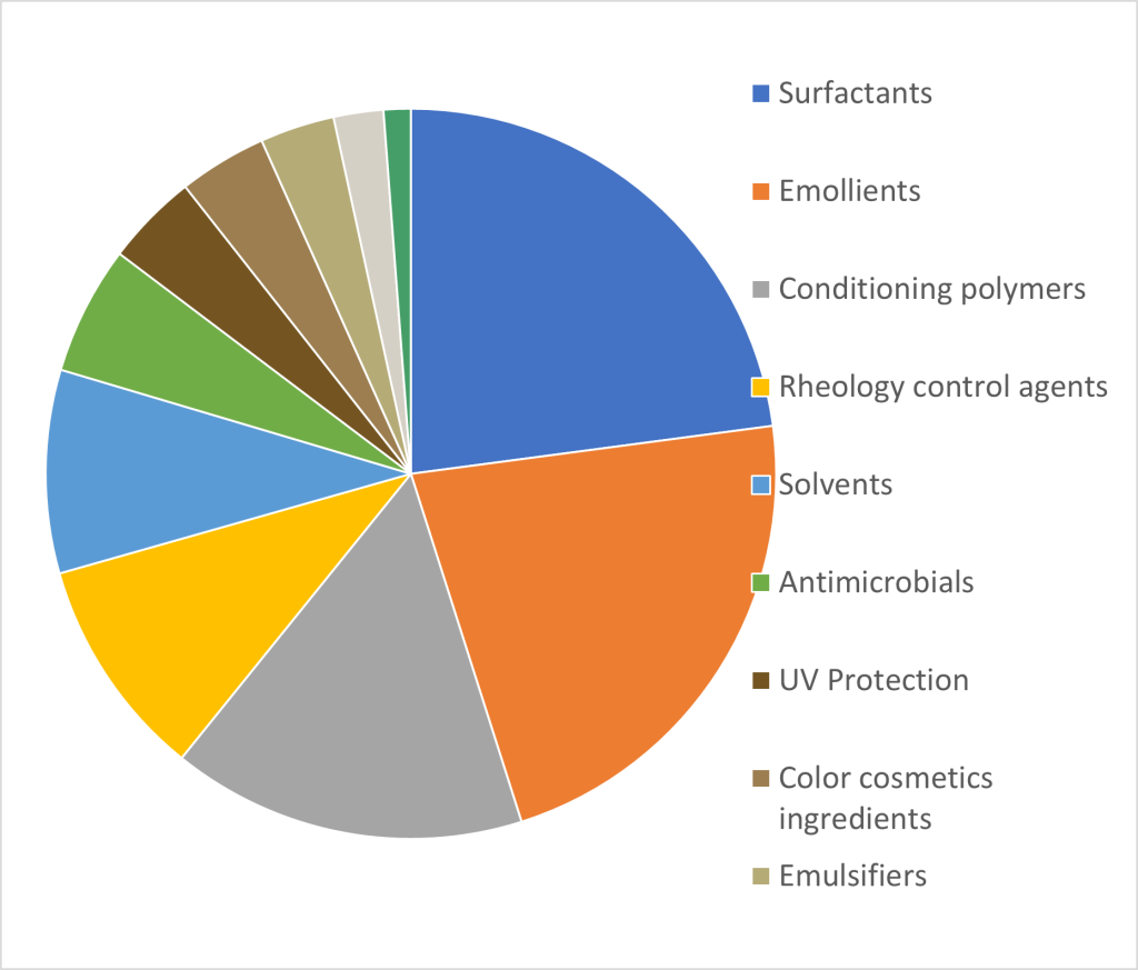 Emollients and Moisturizers play a pivotal role, with shea butter, cocoa butter, and various plant-based oils offering a smooth, silky texture that makes products easy to apply. These ingredients also nourish and moisturize the skin, leaving it feeling soft and supple. We can mention natural extracts, such as aloe vera, chamomile, and green tea extract, that bring a touch of nature to personal care products, offering calming and soothing properties. They enhance the overall sensorial experience by promoting a connection to nature. Kline estimates that Natural oils represent about USD 1 billion globally, a significant part of the emollient group they belong to.