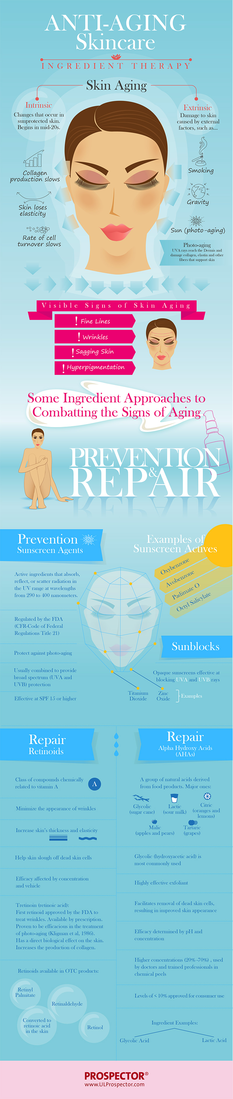 Skin aging is caused by intrinsic and extrinsic factors like the slowing of collagen production (intrinsic) and the effects of sun exposure (extrinsic). How can you use ingredients to combat the signs of aging? This infographic, created with research from industry expert Priscilla Taylor, provides a visual reference for ingredients like sunscreen actives, retinoids and alpha hydroxy acids.