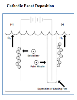 Positively charged cathodic paint is deposited from a bath containing electrocoat paint at the cathode (-) where reduction takes place. Negatively charged anodic ecoat takes place at the anode (+) where oxidation (corrosion) takes place. In a cathodic electrocoat tank, positively charged paint particles migrate to the oppositely charged cathode (substrate) and are neutralized by the electrolysis of water. The paint particles are deposited on the surface of the electrically conductive substrate to form an insulating film. The coated substrate is then baked to eliminate water and remaining volatile as well as to crosslink the polymer film.