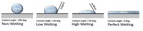 A liquid will spread spontaneously on the surface of a material if the surface tension (force/unit length or dyne/cm) of the liquid is lower than the surface free energy of the solid to be coated. For example, the image below provides a visualization of various degrees of wetting properties for a drop of liquid applied onto the surface to be wet.