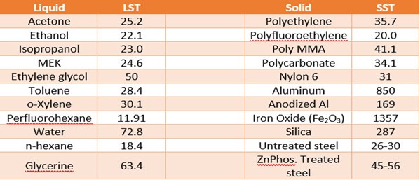 Table 1 – Liquid Surface Tension (LST) and Solid Critical Surface tension (SST) (dynes/cm) @ 20° C