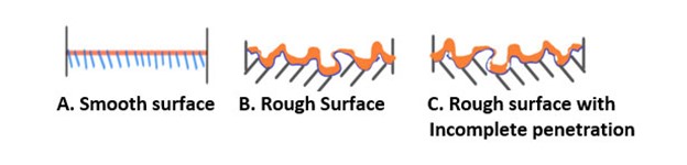 - Mechanical adhesion and internal stress– The profile of the substrate the coating is to be applied to also can affect adhesion. Smoother surfaces are more difficult for coating adhesion as the surface area is lower and provides less area for the coating to interlock with the substrate. However, if a coating is extremely rough, it can be difficult for a liquid coating to wet and penetrate surface crevices. This is illustrated in the diagrams listed below in Figure 2.