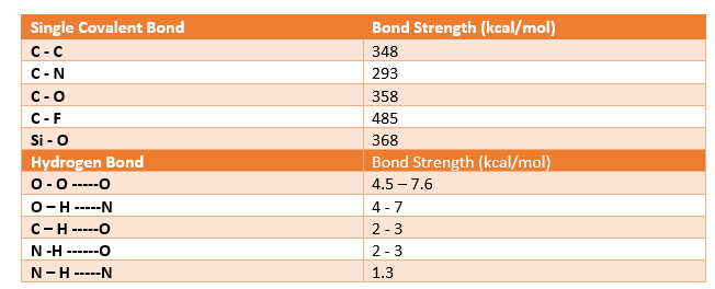 Table 2. – Bond Strengths of various Covalent and Hydrogen Bonds