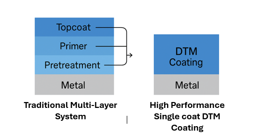 DTM coatings continue to offer a single-layer solution, eliminating the need for separate primers and topcoats. The convenience of applying one coat directly on metal substrates remains a compelling advantage. However more recent DTMs now deliver enhanced corrosion protection, UV durability, and cosmetic appeal previously associated only with multi-layer systems.