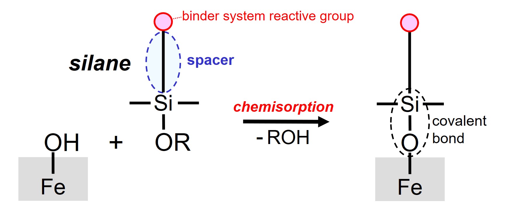 A chemical reaction of one part of the silane adhesion promoter with a hydroxyl group on the steel surface takes place when the adhesion promoter molecule comes in contact with the steel under the right conditions. During this so-called chemisorption, an alcohol molecule (R-OH) is released and a covalent bond (Fe-O-Si) is formed.