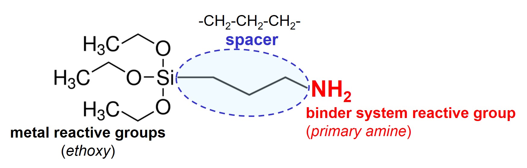 Let’s take a closer look at the APTES molecule. The three metal reactive groups are close to each other. This is critical with respect to both reactivity and flexibility. The second critical aspect is that the molecules contain only one binder system reactive group. Finally, the spacer has a critical length of only 3 methylene (-CH2-) units, providing limited interfacial flexibility.