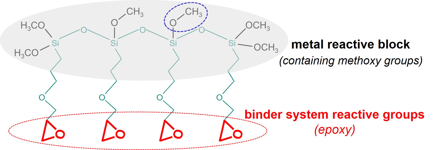 The metal reactive block contains several methoxysilane groups (Si-O-CH3) that can react with hydroxyl groups on the steel surface, under the release of methanol (HO-CH3) molecules. Each molecule has multiple epoxy groups, thus enabling multiple co-crosslinking with the binder system of the primer. Finally, the spacers in MP 200 are more flexible than the spacer in APTES, giving both increased reactivity and more interfacial flexibility.