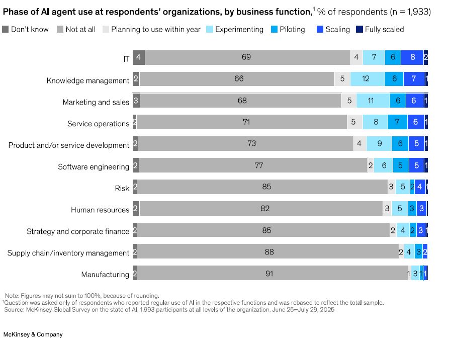 What the two areas have in common is that, even over the past year, AI has started to shift from being a mere assistant to a core driver of efficiency and innovation in polymer manufacturing. But equally, not all manufacturing companies are embracing AI with the same energy and enthusiasm: lest we should think that in 2025 the use of AI in manufacturing is as widespread as a casual glance at the media might suggest, Fig 1 shows the result of an international survey by McKinsey. This shows that in the manufacturing sector, 91% of respondents described their use of AI as “Not at All”! That said, most have begun to use AI somewhere in the organization, most at the early stages of scaling and capturing enterprise-wide value.
