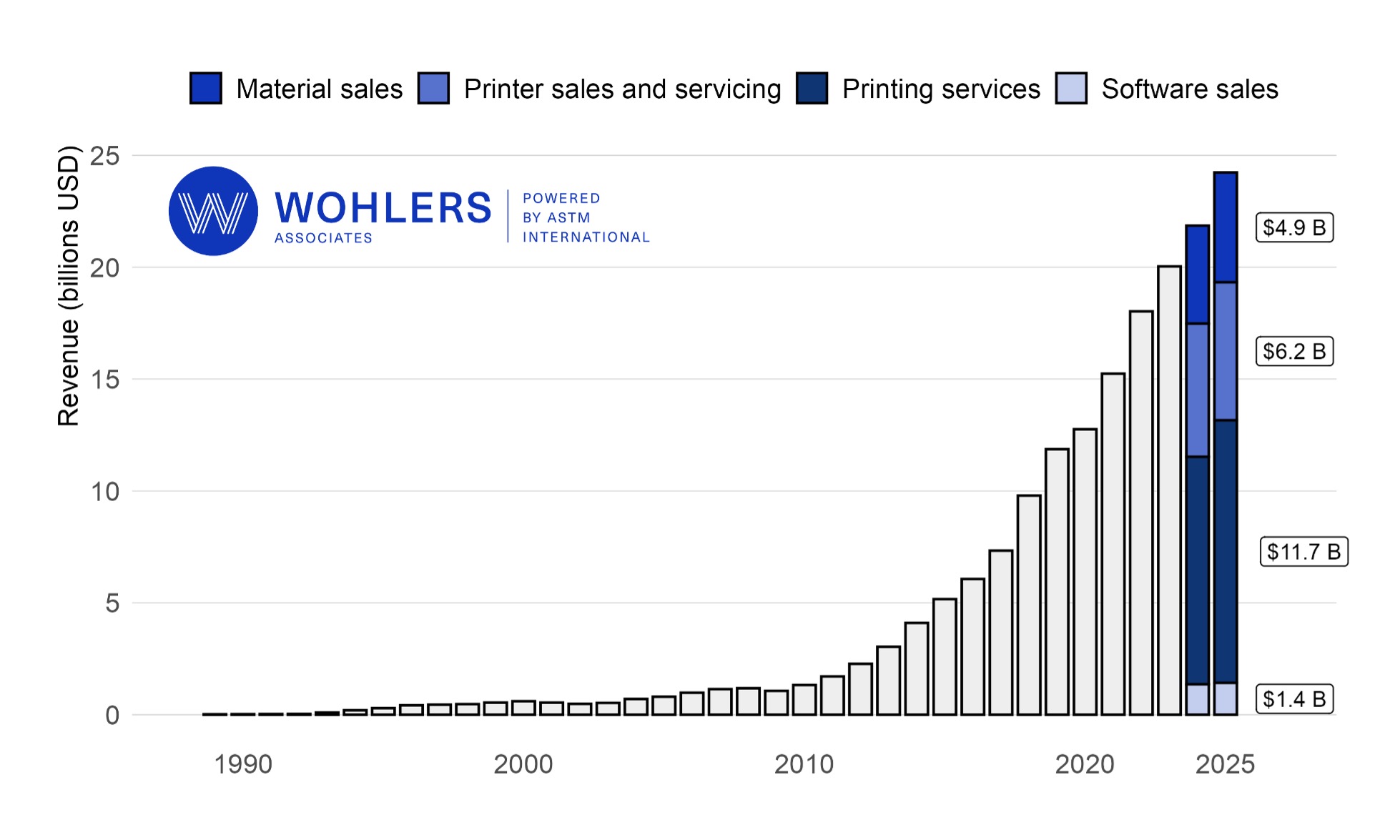 It estimates in the 195-page report that global additive manufacturing revenues reached $24.2 billion in 2025, up 10.9 percent year over year. That included $4.9 billion in material sales.