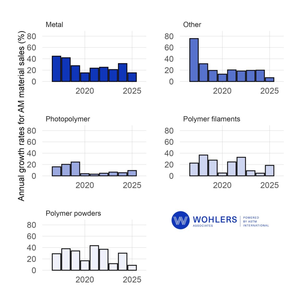 “The fastest-growing segment of the AM material market was polymer filaments in 2025, at 18.5 percent over 2024 revenues. This was a significant boost from the paltry 4.7 percent growth the year prior, perhaps driven by the continued surge of low-cost desktop material extrusion (MEX) systems,” Jamshid said.