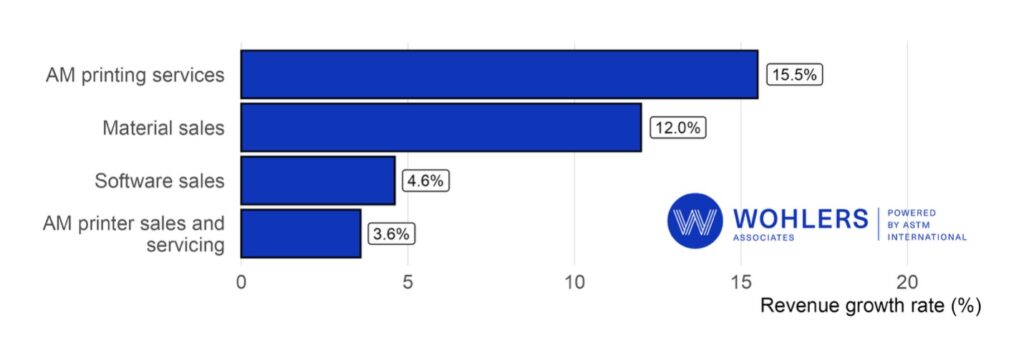 He added that metals, including both powder and wire, also grew significantly at 15.3 percent year-over-year. These categories grew at a significantly faster pace than photopolymers (9.4 percent), polymer powder (8.7 percent), and other materials (6.7 percent).