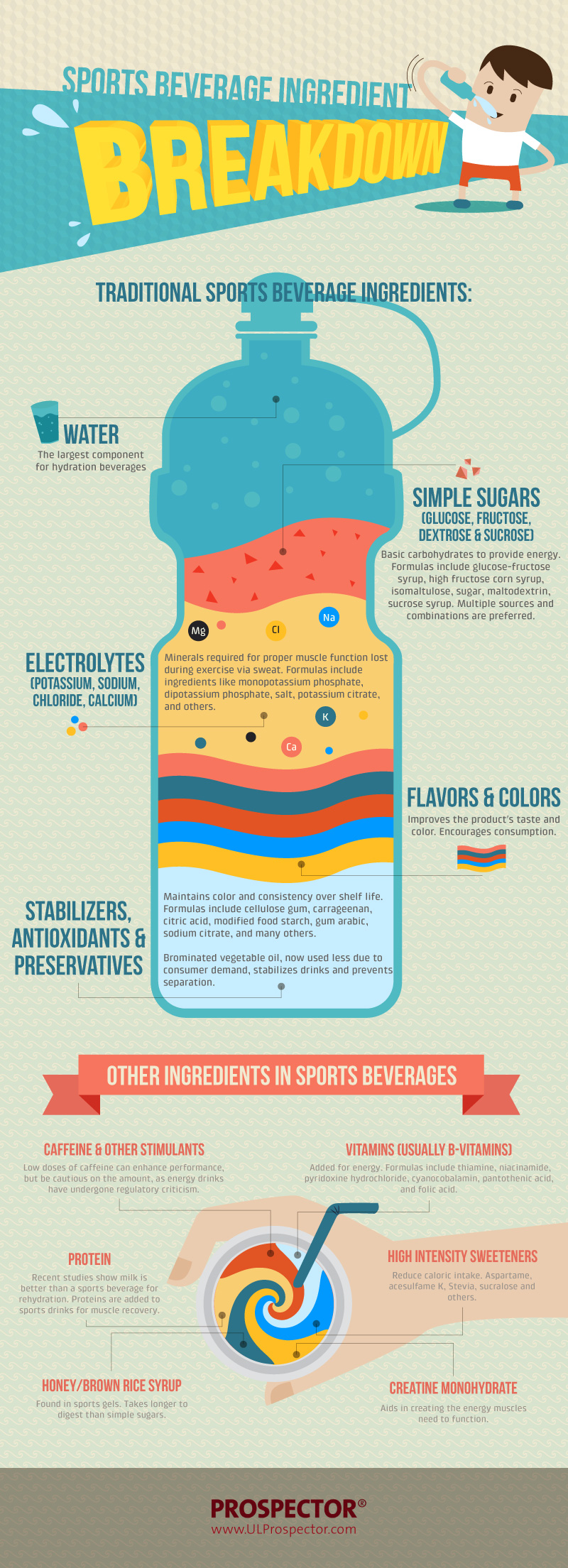 Basic sports beverage (EU) ingredients provide energy, electrolytes (EU) and hydration, as well as flavor, color and preservation. Some sports drinks also include stimulants, vitamins, protein and other specialty ingredients. Explore the range of ingredients found in typical sports beverages in this infographic.