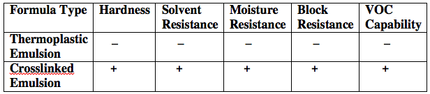 The resultant coating of the cross-linked network offers lower solubility in water and solvents, higher Tg and thus a tougher film with higher hardness. Performance properties of thermoplastic emulsions vs. crosslinked emulsions may be summarized as the chart at right shows.