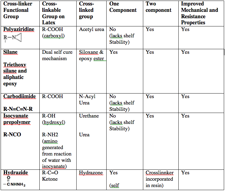 In addition to the advantages listed in the above table, many crosslinked systems provide higher gloss capability and improved adhesion, as well as better exterior durability. The use of crosslinkers in water-born coatings include polyaziridines, epoxy silanes (EU), carbodiimides (EU) and adipic dihydrazide, as well as suitable isocyanate (EU) functional prepolymers. The table to the right illustrates the reactive groups and considerations with the use each of each type of cross-linked system.