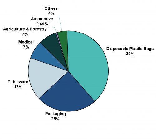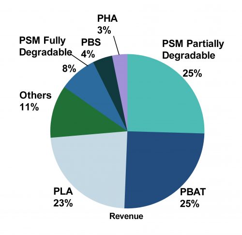 China’s bio-plastics industry is dominated by three main types of products, partially degradable plastarch material (PSM), polybutyrate (PBAT) and polylactide (PLA) – each with roughly equal market shares by revenue.