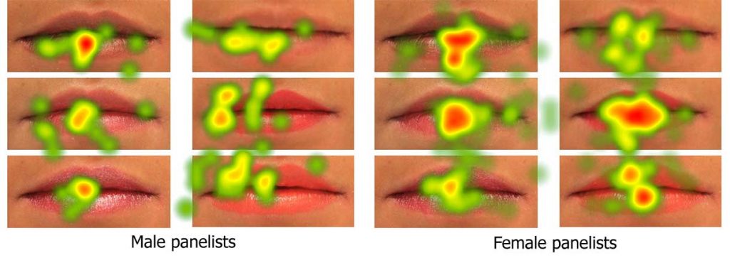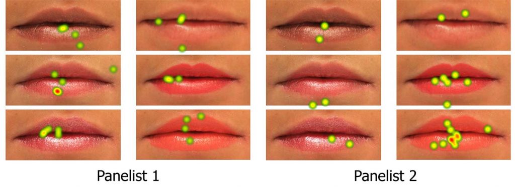 Below is an example of eye-tracking based on the application of six lipsticks of different colors. With the help of this technique, you can predict which shade or color will attract more attention from the panelist. Eye-tracking generates heat maps that indicate the intensity in time and duration of greater interest. If the panelist pays more attention to an area, the color is redder.