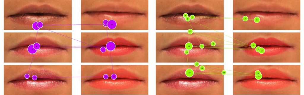 It is also possible to observe the sequence of saccades, or quick movements of both eyes. This is also interesting because you can determine which colors are looked at first, which indicates greater interest, as shown in Figure 2 below. You can see in this example, the panelists started looking at the same lip color, which can support the selection of a color in the design stage.