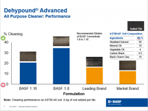 For primary cleaning, a 1% active solution of Dehypound Advanced (the recommended level for a ready-to-use all-purpose cleaner, or APC-RTU), was tested using an ASTM soil A6. Dehypound Advanced was found to have cleaning performance superior to the market leading APC-RTU products. BASF’s excellent results were achieved with neither builders nor solvents (ingredients included in typical APC-RTUs formulations).