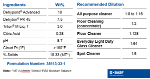 Dehypound Advanced’s unique flexibility enables its wide usage amongst a variety of applications. Many different types of formulations can be made simply by adjusting the level of the ingredient. BASF utilized this surfactant’s feature to develop a base formulation concentrate (See Figure 3). This formulation can be diluted to different levels to create different types of cleaners. The 1:8-1:16 dilution, for example, can be used as an APC (RTU); 1:2 can be used as a concentrated floor cleaner; 1:128 dilution is perfect for an RTU floor cleaner; the 1:6 dilution works excellently as an RTU spot cleaner for carpets, and 1:16 aligns with light-duty glass cleaner needs. The performance of the glass cleaner can be further improved by adding 2.9% IPA, which will yield a premium glass cleaner. In institutional settings, cleaning professionals can easily dilute Dehypound Advanced to achieve different formulations for different applications.