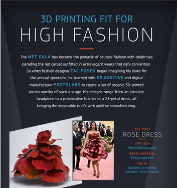 The garments and accessories, worn at the annual fundraising event for the Metropolitan Museum of Art in New York, were the result of an uncommon collaboration by noted designer Zac Posen, GE Additive, and Protolabs. The fashions were worn by British supermodel Jourdan Dunn, and actresses Nina Dobrev, Katie Holmes, Julia Garner, and Deepika Padukone.
