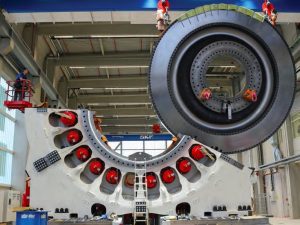 Newer turbines are becoming steadily larger—with the resulting higher loads, it is not uncommon to see main shaft bearings that are 2-3 meters in diameter (see Figure 1), and some of the largest main shaft bearings are 6 meters in diameter. For the largest turbines, physical limitations on the maximum speed of the blade tips determine the much slower rotational speed of the hub. Arnoud Reininga, global engineering manager for Energy Industries for the SKF Group, notes that the largest wind turbines currently have rotor diameters of 220 meters. For these turbines, he explains, if the main shaft rotates at 10 RPM, the tips of the blades rotate faster than 100 m/s. (At ground level, the speed of sound in air is about 340 m/s.) The wind turbine’s main bearing is responsible for the efficient transfer of this slow-speed rotation energy to the gearbox, which steps up the rotational speed to power the electrical generator.