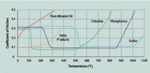 AW additives protect against wear and the loss of metal surfaces, and the EP additives decrease wear due to high localized pressure, preventing seizures. As stated previously, they perform similar functions. Hunter explains, “Both AW and EP additives prevent metal-to-metal contact by forming a film that yields under the shear stress imposed during boundary lubrication conditions. It is the heat from the friction generated between moving surfaces that provides the energy for chemical reaction between the additive and the metal surface to form sacrificial, protective films. These films fill the asperities, thereby reducing friction by preventing metal-to-metal contact, which can prevent surface wear and welding. However, the films are labile at high temperatures and are removed by the moving surfaces in contact. New films must form on the nascent metal for continued protection.” Figure 4 shows the temperatures at which different AW and EP chemistries react to form protective films.