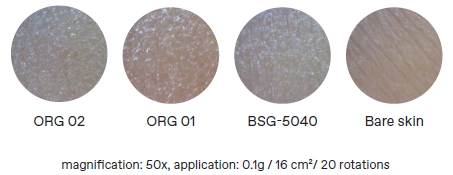Upon application, PURESIL™ ORG 01 and ORG 02 impart both sensory and line-blurring effects, transform dry and rough skin into a velvety, elastic, smoother, younger-looking skin with a natural healthy glow. Figure 2 shows the line-blurring effect of eye creams with 20% silicone elastomer gels compared with bare skin. The PURESIL™ BSG-5040 in the comparison is a silicone elastomer gel delivered in cyclopentasiloxane (D5), a well-known benchmark in the silicone elastomers category.