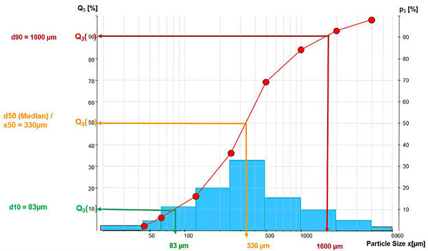 When referring to particle size distributions the median can also be called the D50, meaning that fifty percent of the particles are smaller than this diameter. Similarly, the D90 is the value under which ninety percent of the particles measured fall. The final common descriptor of particle size distribution we will discuss is the D10. This is the value that ten percent of the particles size distribution falls below. Taken together, these three values allow us to visualize the particle size distribution of our sample. We can determine if the distribution is normal (distributed evenly around the median) or skewed. The graphic below shows an example of these three particle size descriptors (Graphic from MICROTRAC website).