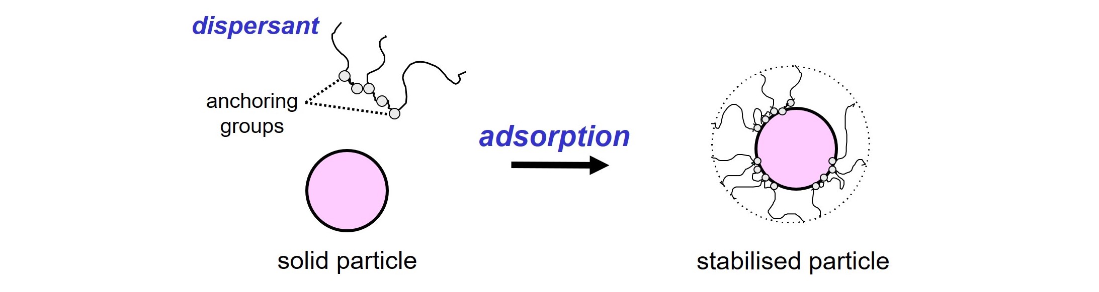 To do their job, dispersant molecules must be adsorbed at the surface of the solid particles. The chemical composition of the surface of a particle governs what dispersants will be able to adsorb strongly at that surface. Adsorption behavior can be influenced by choosing the right anchoring groups, being part of the dispersant molecules, or by applying the proper post-treatment of the particles. The latter is especially important with respect to hydrophobic particles, like most organic pigments and carbon blacks. The particles of untreated carbon black pigments, for example, are hydrophobic because the surface consists (mainly) of carbon. It is difficult to adsorb polymer molecules at the surface of hydrophobic particles.