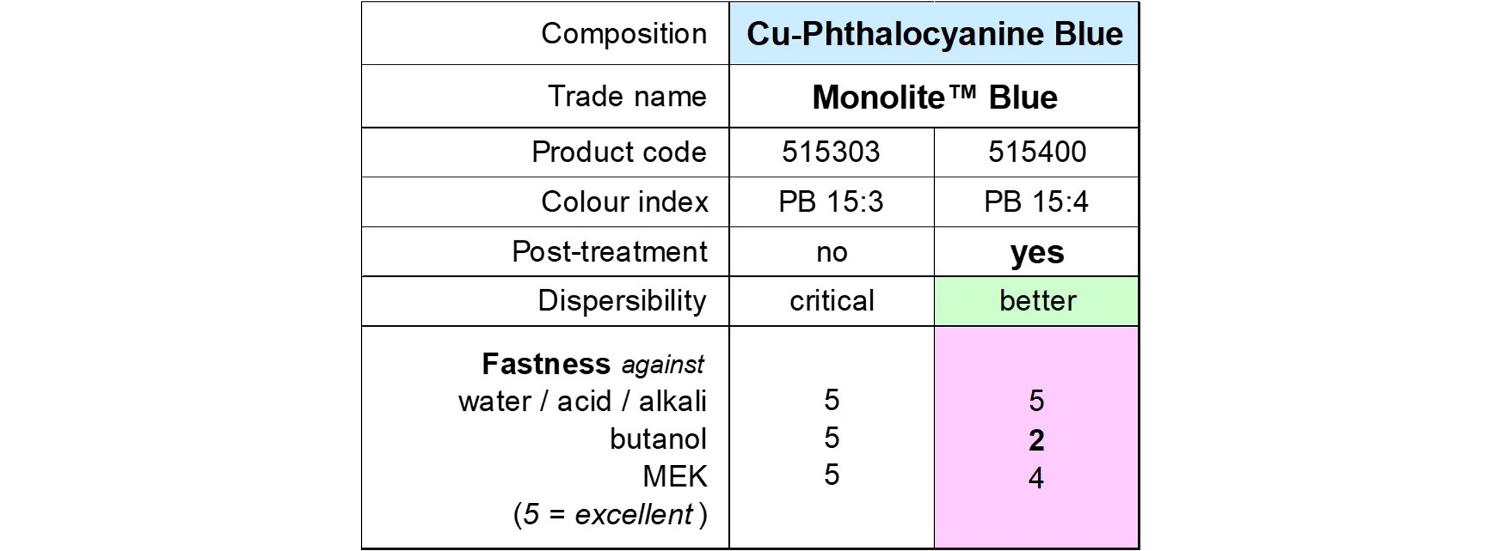 In this example, post-treating the blue pigment particles, going from PB 15:3 to PB 15:4, improves the dispersibility of the pigment but at the expensive of fastness against solvents, especially alcohols.