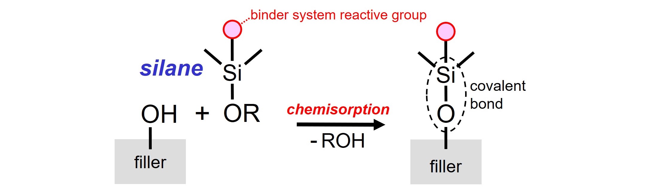 Bifunctional silanes can be used as so-called coupling agents, to post-treat solid particles that have hydroxyl (-OH) groups on their surface.2 One type of chemical group of such silanes reacts with the surface of the solid particles, thus forming a covalent bond. The other type of reactive group is able to participate in the cure of a 2-component resin system during film formation. The principle of coupling solid particles and binder matrix is identical to the chemical modification of a substrate to enable adhesion via covalent bonds, so-called interfacial crosslinking.3