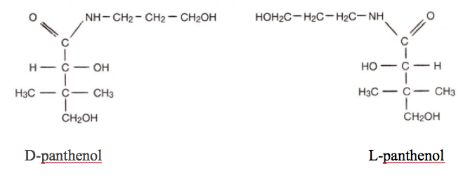 During synthetic preparation of panthenol, the racemic mixture (DL-panthenol, containing 50:50 of each form) is formed. Biological activity occurs only for D-Panthenol (Dex-Panthenol); literature methods for synthesis of only D-panthenol exist. For cosmetic use, Panthenol can be obtained in the D form, or as the racemic mixture. D-Panthenol is a highly viscous transparent liquid at room temperature. However, DL-Panthenol and salts of pantothenic acid are white powders. Both forms are soluble in water, alcohol, propylene glycol (EU), ether (EU), chloroform (EU), and slightly soluble in glycerin (EU).