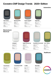 To that end, its CMF team has developed three industry-specific aesthetic toolkits, responding to trends in 2025 and beyond. Its research focuses on three major industries –– electrical and electronics (E&E); automotive/mobility; and healthcare. Each year it assesses the coming trends in this space, especially as they relate to Covestro’s primary resins of polycarbonate (PC) and PC/ABS blends, though the concepts typically can be applied more broadly to other resin types.