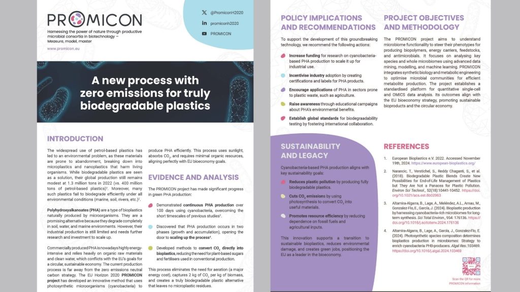 ‘Commercially produced PHA is nowadays highly energy-intensive and relies heavily on organic raw materials and clean water, which conflicts with the EU’s goals for a circular, sustainable economy. The current production process is far away from the zero emissions neutral carbon strategy.’ – explain the authors of PROMICON’s policy brief.