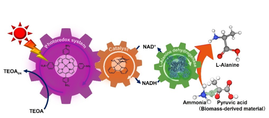 This time, by using L-alanine, an amino acid with a similar structure, the team created raw material for a nylon-type biodegradable plastic. Artificial photosynthesis technology was developed with the addition of the biocatalyst L-alanine dehydrogenase, which combines ammonia with pyruvate to produce L-alanine, to the photoredox system composed of a dye and a catalyst.