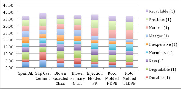 She learned that people don’t have a strong reaction to material samples, but they do have an emotional connection to specific products made from those materials. In her surveys, she provides similar products, such as drinking cups, made from different types of materials (aluminum, ceramics, glass and various plastics), and asks people to rank them (see photo and graphs – if you choose to use them).
