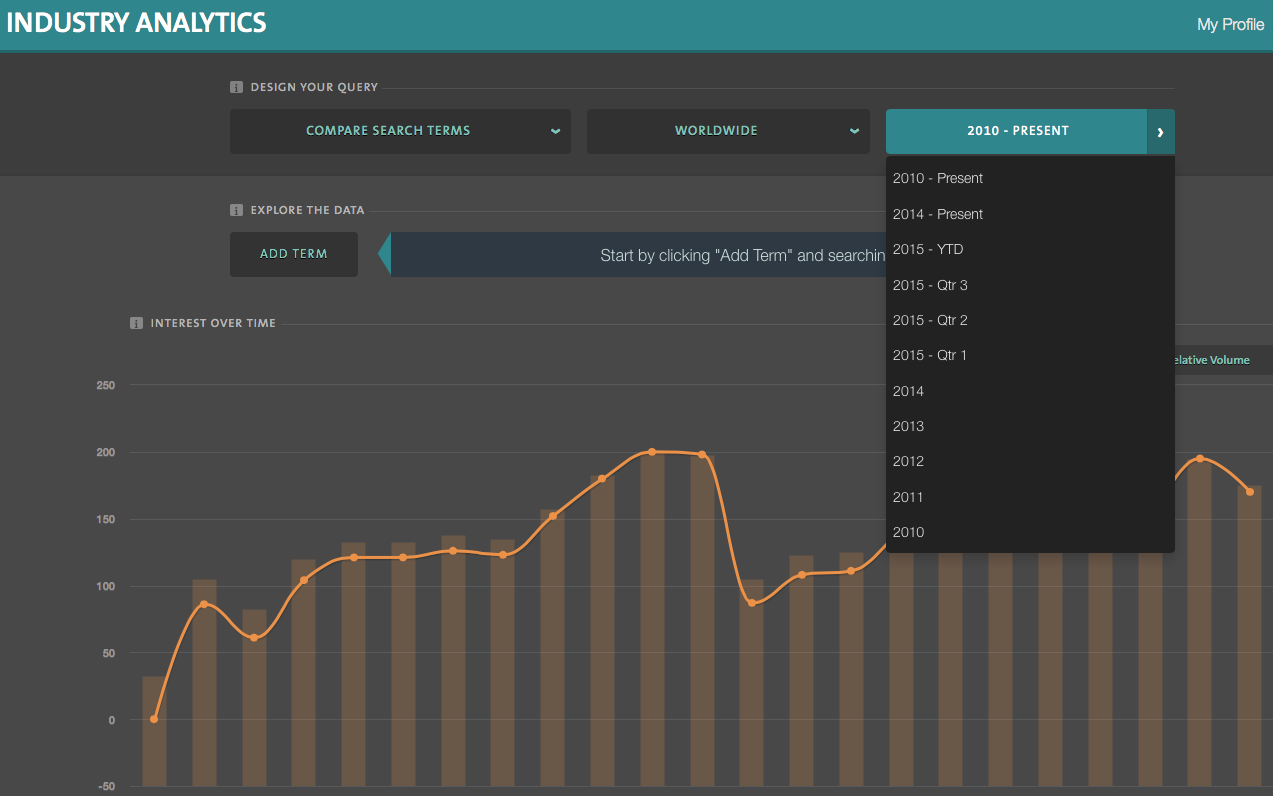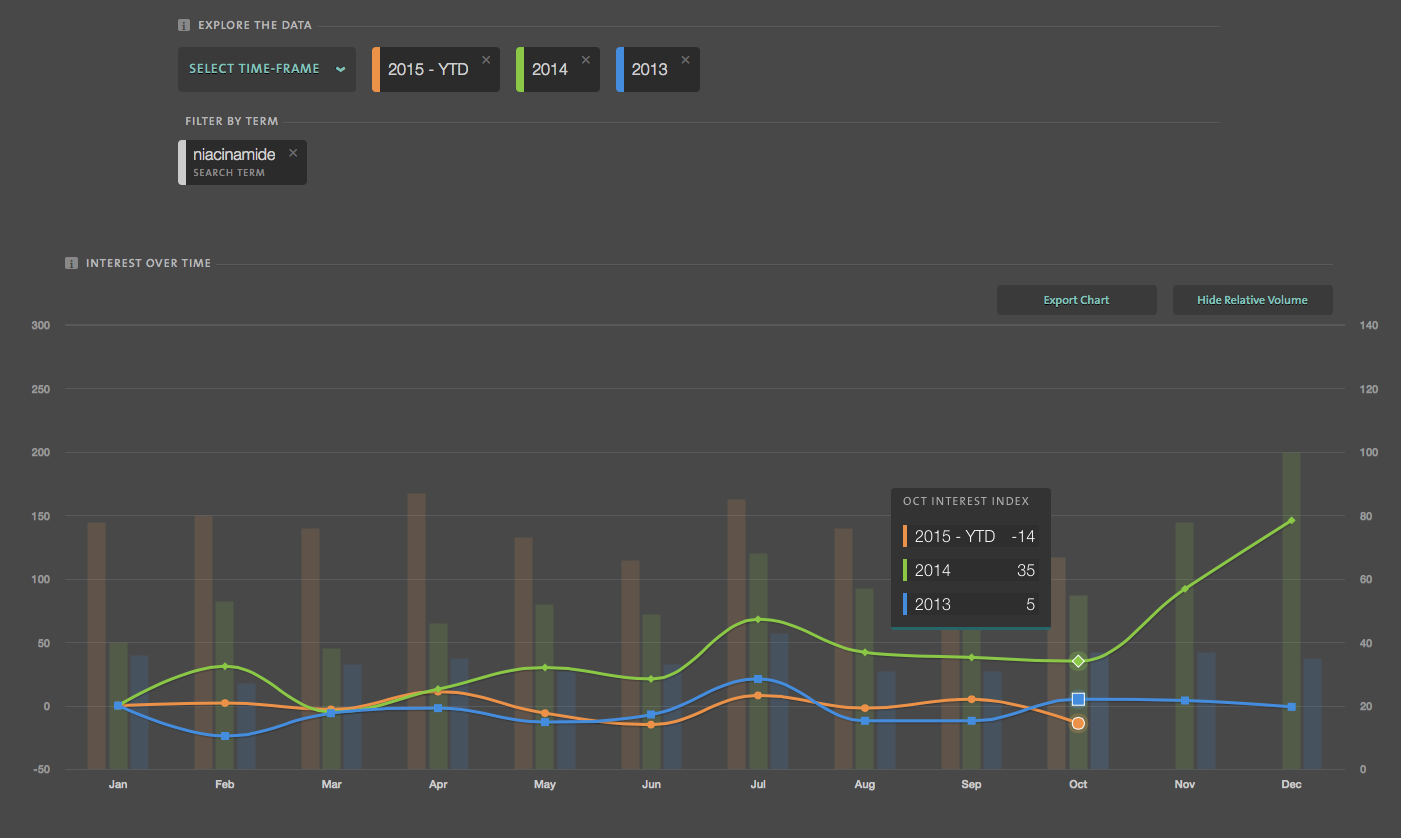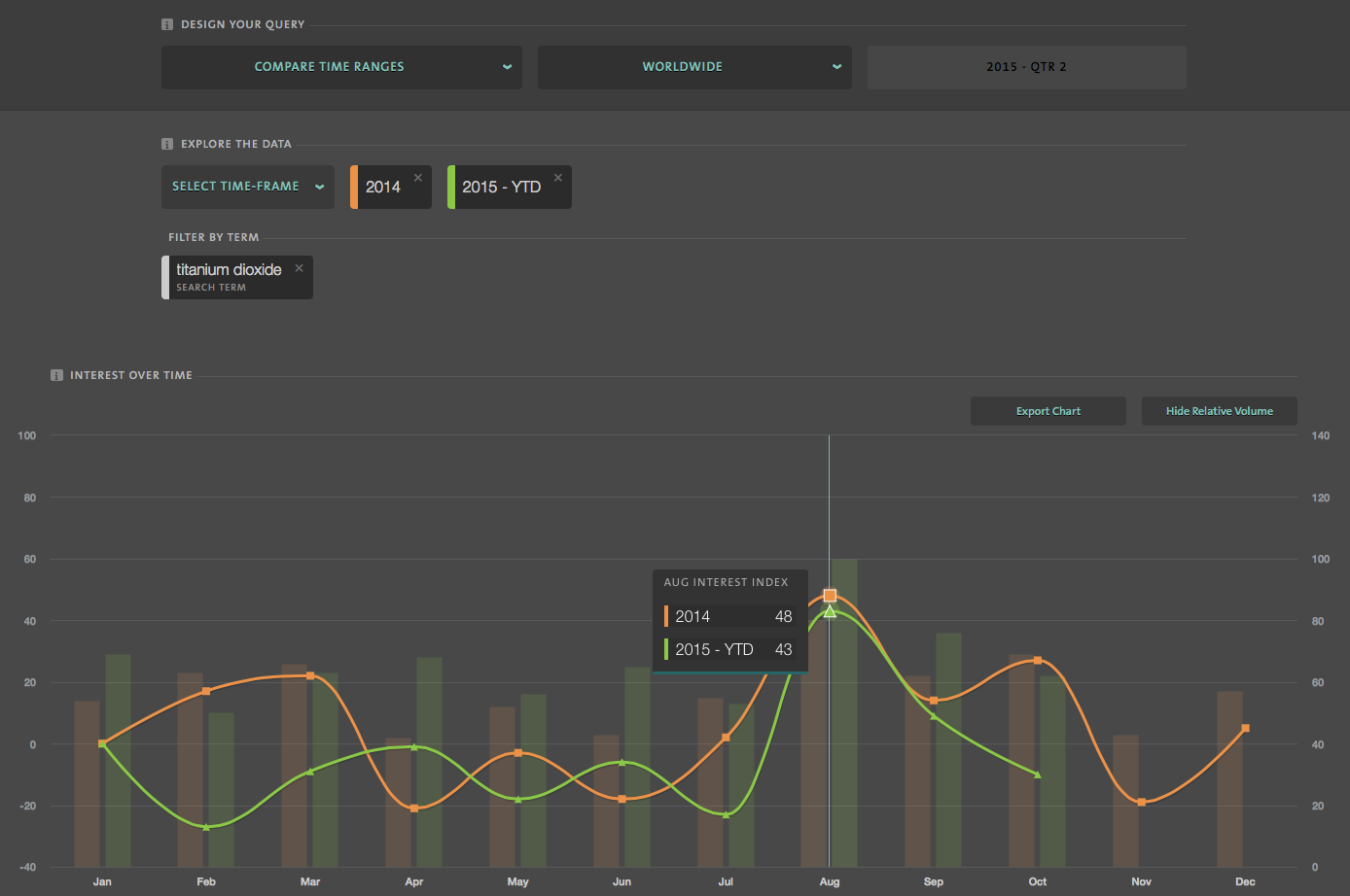 View year over year comparisons with the “Compare Time Ranges” query. Here you can see a comparison for the term “titanium dioxide” for 2014 and 2015 YTD.