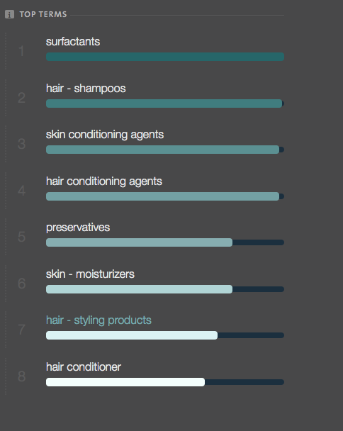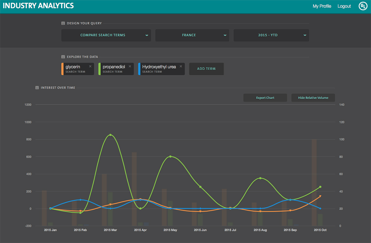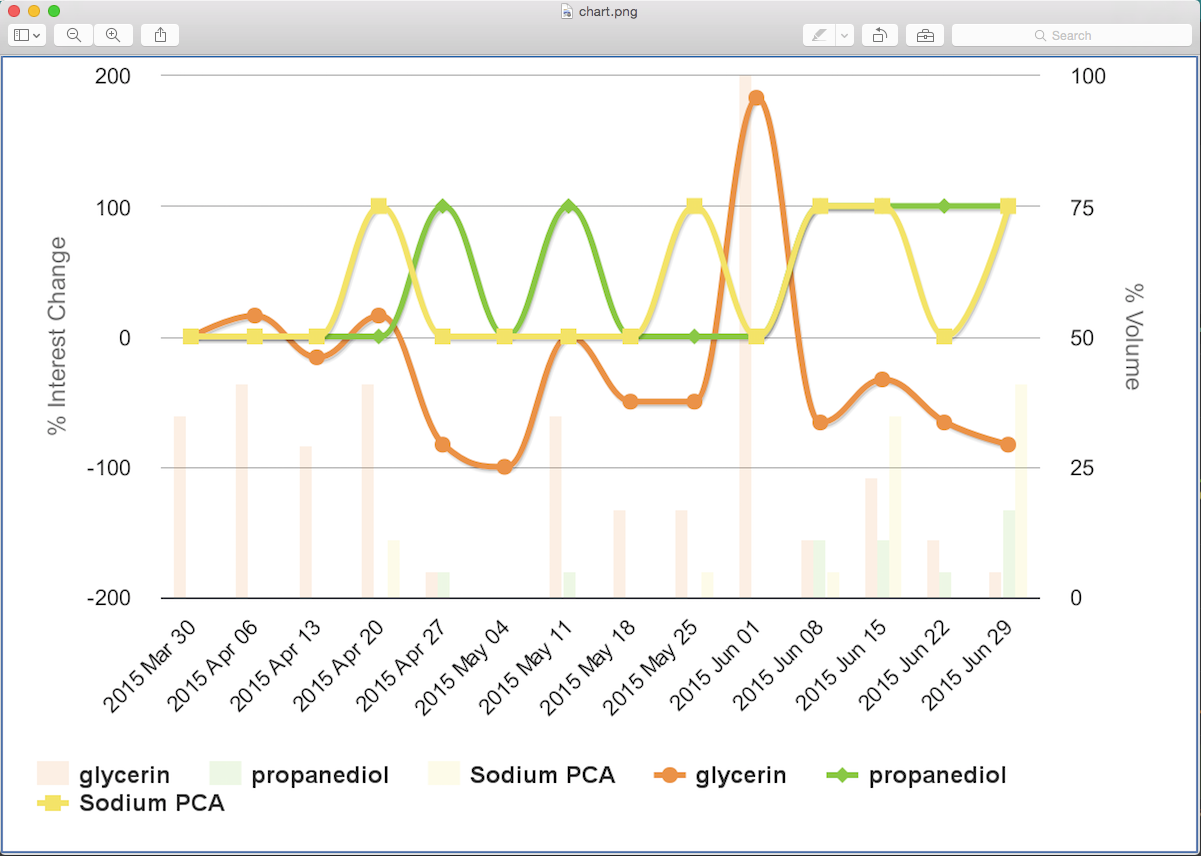 Industry Analytics allows you to compare search terms and categories over time. Here we’ve searched for several materials used as moisturizing humectants.