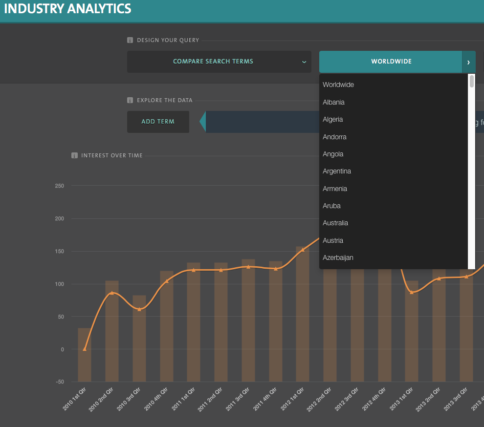 “Top Terms” show you the most popular keyword searches for the time period and country of your choice. Want to add these terms to the chart and map comparison views? Simply click the search term, and it’s automatically added.
