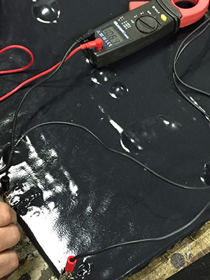 First, they sprayed alligator clips into the coating and connected them to an electricity meter. The strips were plugged into a wall socket and readings from the e-meter proved the material was conductive at 120v AC.