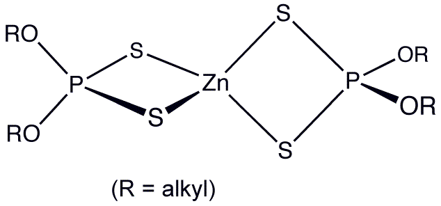 Zinc is bound to the anion of dialkyldithiophosphoric acid (e.g. ammonium diethyl dithiophosphate).3 The compound is also known as ZnDTP and ZDP.4