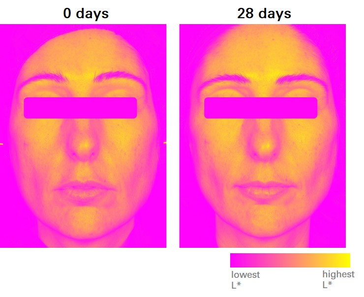 Another clinical test was carried to evaluate the skin radiance and anti-aging effect of the peptide. After 28 days of active treatment, macrophotographs of the face were acquired with a high-resolution camera, and images were processed with the Luminosity software, which allows to visualize the range of luminosity values in a color map. The luminosity parameter increased after treatment, showing a glowing radiant complexion.