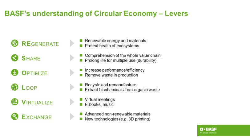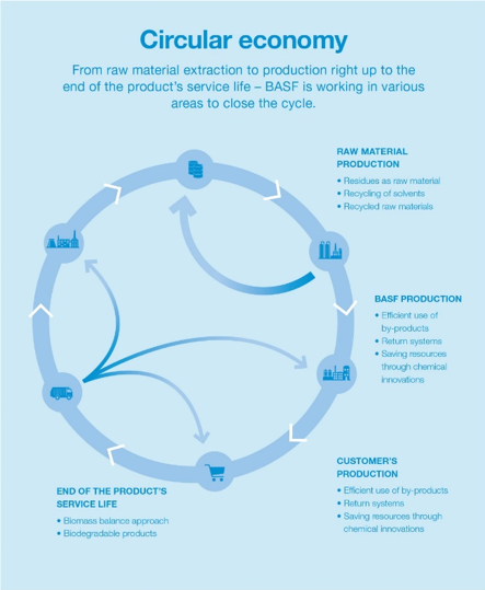The BASF interpretation of the circular economy concept follows two complementary approaches. The first, “KEEP IT SMART”, is designed to make processes and products more efficient (both for in-house production and for the customers’ production processes) by using raw materials efficiently, which leads to waste minimization and prevention. The second approach, the “CLOSE THE LOOPS” approach, aims to create a second life for products and materials