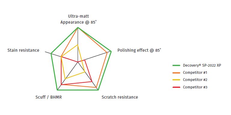 Above all, the unique proprietary technology behind the Decovery® SP-2022 XP resin facilitates coating systems that are quick and easy to formulate, driving the practicality of the overall coating process. In particular, the self-matting Decovery® SP-2022 XP resin enables coating formulations without supplementary matting agents and additional process steps. This leads to fewer operational and formulating mistakes, as well as up to one-hour time savings in operations compared to other commercial alternatives.